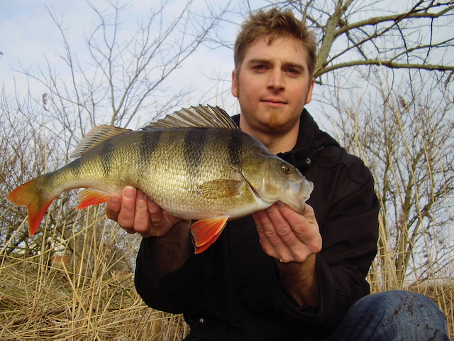 Jeg startede med at fiske en af de kendte hotspots, dog uden at mærke så meget som et nap. Først da jeg begyndte at fiske over til modsatte bred i ind i mellem sivene skete der noget. Første kast der over resulterede i en aborre omkring 800-900gr, ikke dårligt! 3. kast bang! den gik tungt ude i strømmen og efter en herlig tung fighte, kunne jeg nette årets første specimen aborre 1,1kg fordelt på 41cm. En smuk kugle rund dame skulle til fotosession hos Peter og Jesper, så var dagen redet.