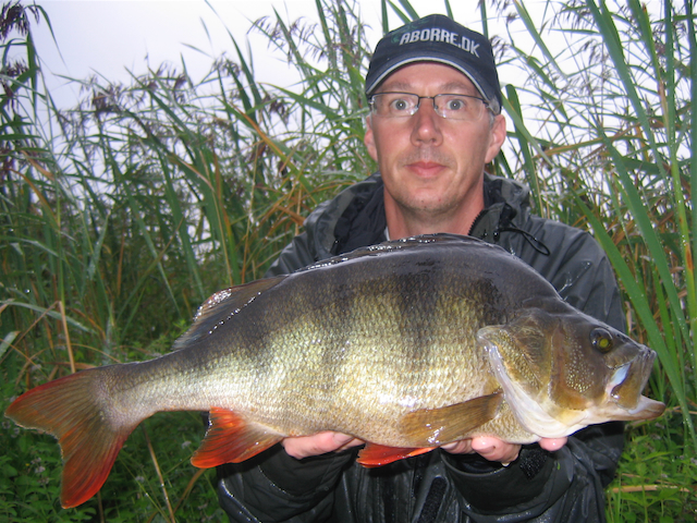 I løbet af natten havde jeg kun et hug fra en mindre aborre. Det regnede af pommern til og forhåbningerne var ikke store, da en af bidmelderne ved 8 tiden gav en solid hyletone. Jeg gav modhug med det samme og på vægten i modhugget – kunne jeg mærke, at det var en god aborre, der måtte havde taget den døde halve agnskalle. Den trak volsomt til siden, så det var lidt svært at vurdere størrelsen, men da jeg skulle til at landede den – var jeg klar over at det helt sikkert var en ny PR.